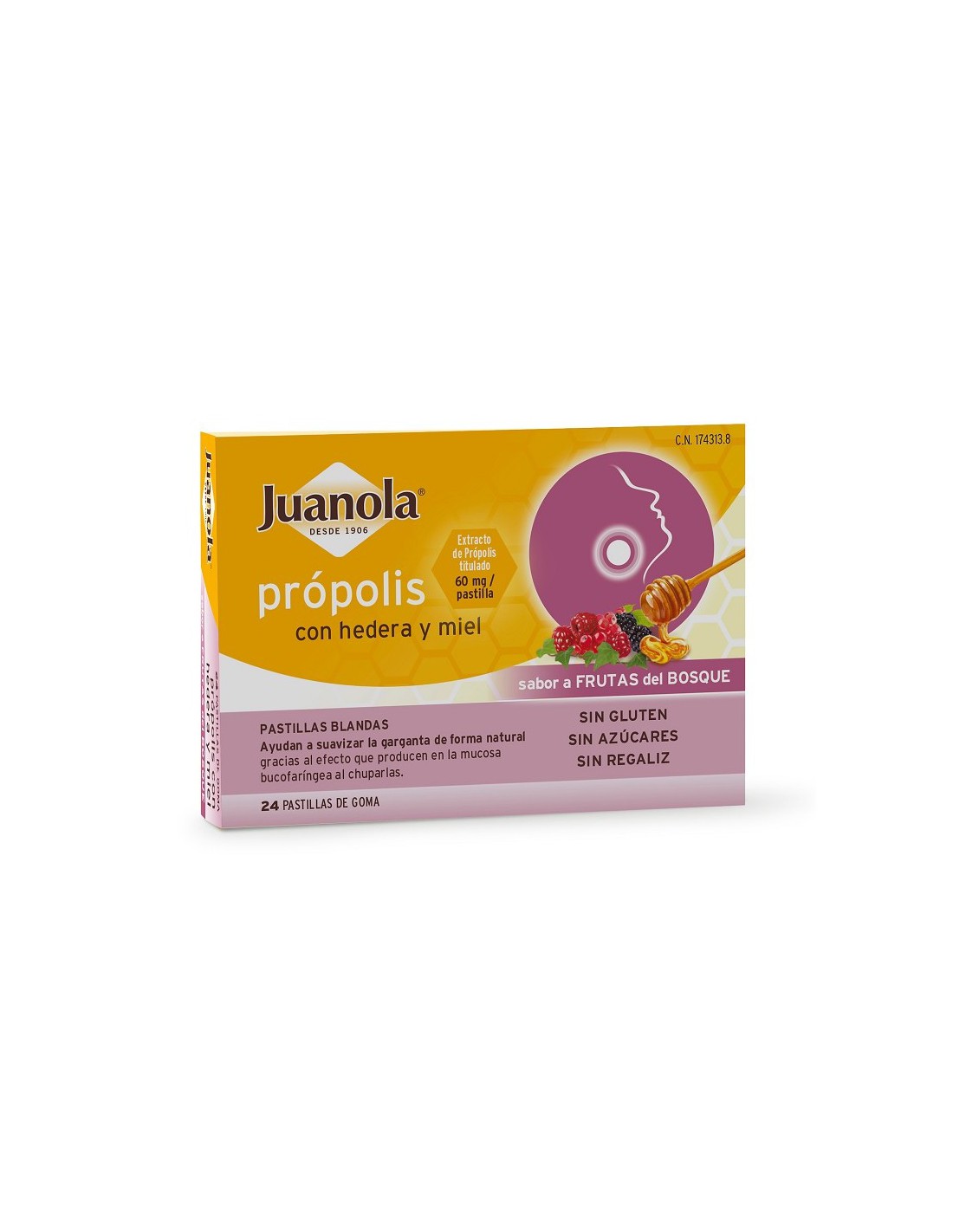Juanola própolis + hedera con miel son unas pastillas blandas que combinan el efecto del extracto de própolis (60 mg/pastilla), el extracto de Hedera helix (12 mg/pastilla) y la miel (10 mg/pastilla) para suavizar la garganta gracias al efecto que producen las pastillas en la mucosa bucofaríngea al chuparlas.